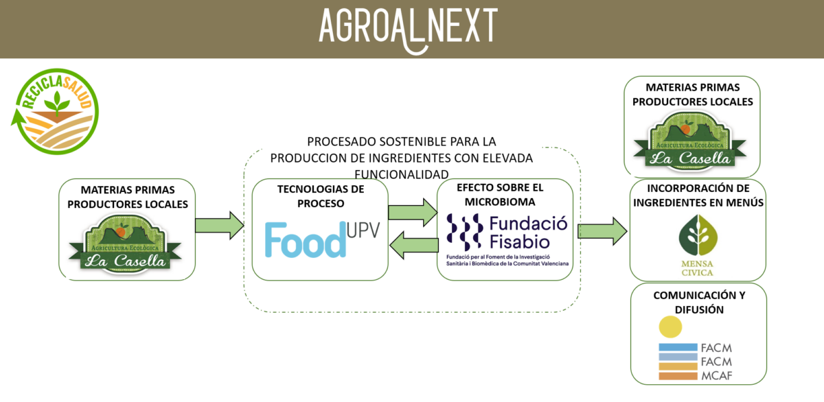 El proyecto ReciclaSalud pretende tener una importante dimensión social y local para que los resultados de la investigación puedan repercutir directamente en las personas. Por ello, cuenta con la participación activa de pequeñas empresas locales vinculadas con los eslabones más importantes de la cadena alimentaria. Por ejemplo, en el proyecto participa ‘La Vall de la Casella Coop. V’, una cooperativa de producción ecológica que proporcionará la materia prima que se va a utilizar en el proyecto y será punto de contacto con los agricultores para facilitar la transferencia de la tecnología utilizada en el proyecto o la utilización de un sello distintivo para la promoción de los productos locales. También participan la Fundación Asamblea de Ciudadanos y Ciudadanas del Mediterráneo (FACM), una red que promueve el diálogo y la acción ciudadana; y la Asociación Mensa Cívica, una asociación sin ánimo de lucro centrada en la comida social, la alianza territorial y sistemas alimentarios más diversos y sostenibles. Junto a estas entidades se realizarán actividades de formación y difusión.