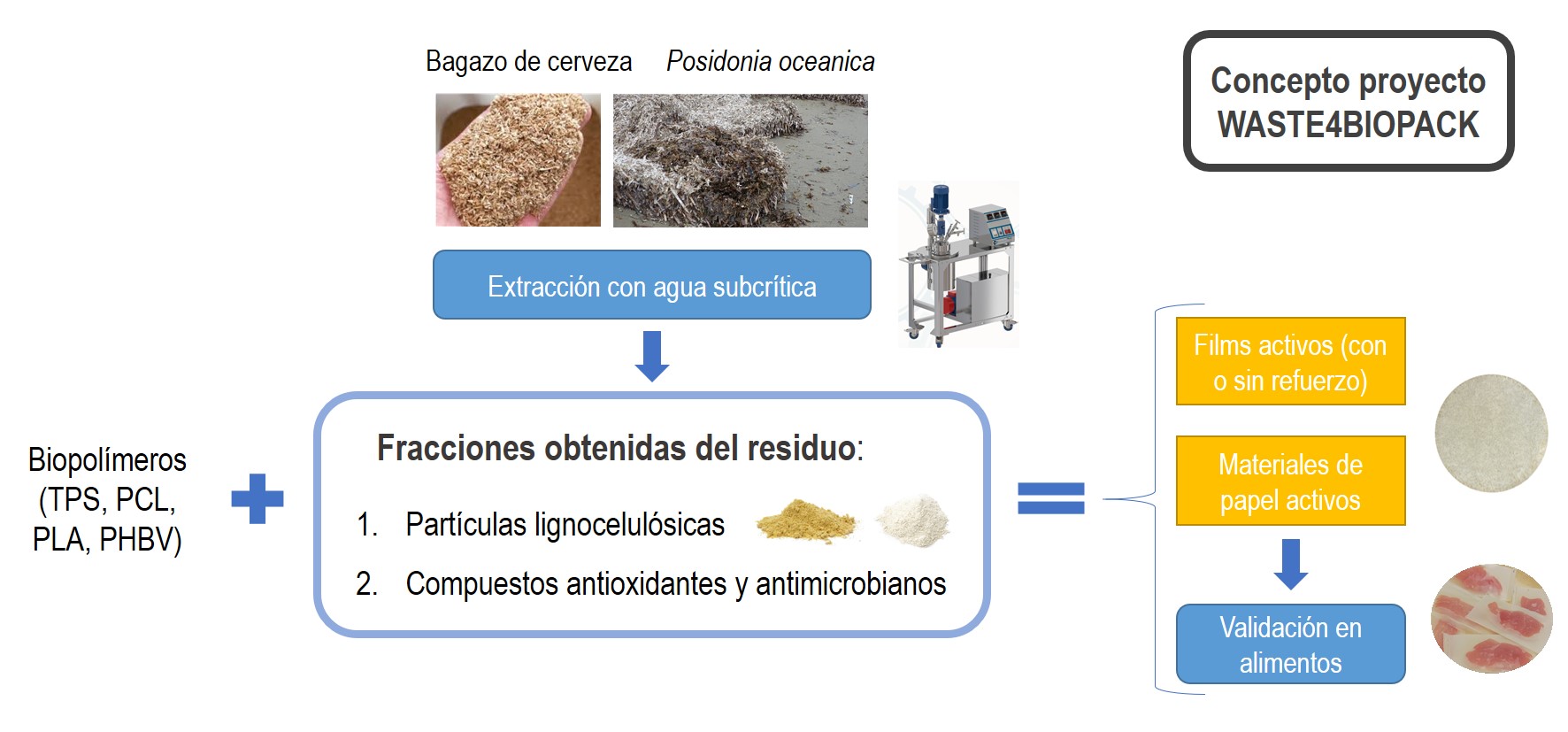 Partiendo de estos puntos se esta llevando a cabo el proyecto WASTE4BIOPACK, el cual tiene como objetivo principal utilizar residuos agroalimentarios de la elaboración de la cerveza, como el bagazo, y la «Posidonia oceanica», ricos en celulosa, lignina y compuestos relacionados, para la producción de envases biodegradables alimentarios. En el caso de la cerveza, se estima una producción de 760 toneladas al año de bagazo de cerveza en España. Para la Posidonia, una planta acuática mediterránea, es más difícil obtener un dato regular, pero por ejemplo en el año 2014, se recogieron de las playas alicantinas cerca de 181 toneladas de Posidonia y algas entre los meses de enero y abril, de ahí su potencial para valorizarla.